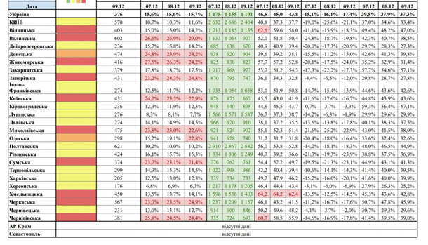 В "желтой" зоне карантина по состоянию на пятницу, 10 декабря, находится 13 регионов, 10 – в "красной" и еще две области – в "оранжевой". Это следует из данных на сайте Минздрава.